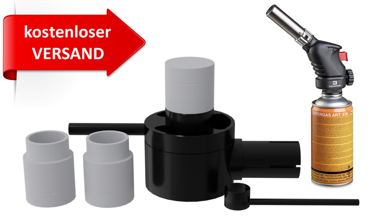 The gas sublimator comes with three dosing caps for smooth work and a dosing spoon that ensures safe and accurate dosing.