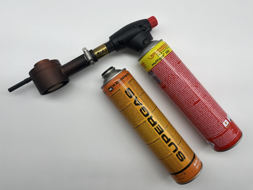 First, screw the gas burner onto the gas cartridge, then place the sublimator onto the burner and secure it using the supplied clamp.