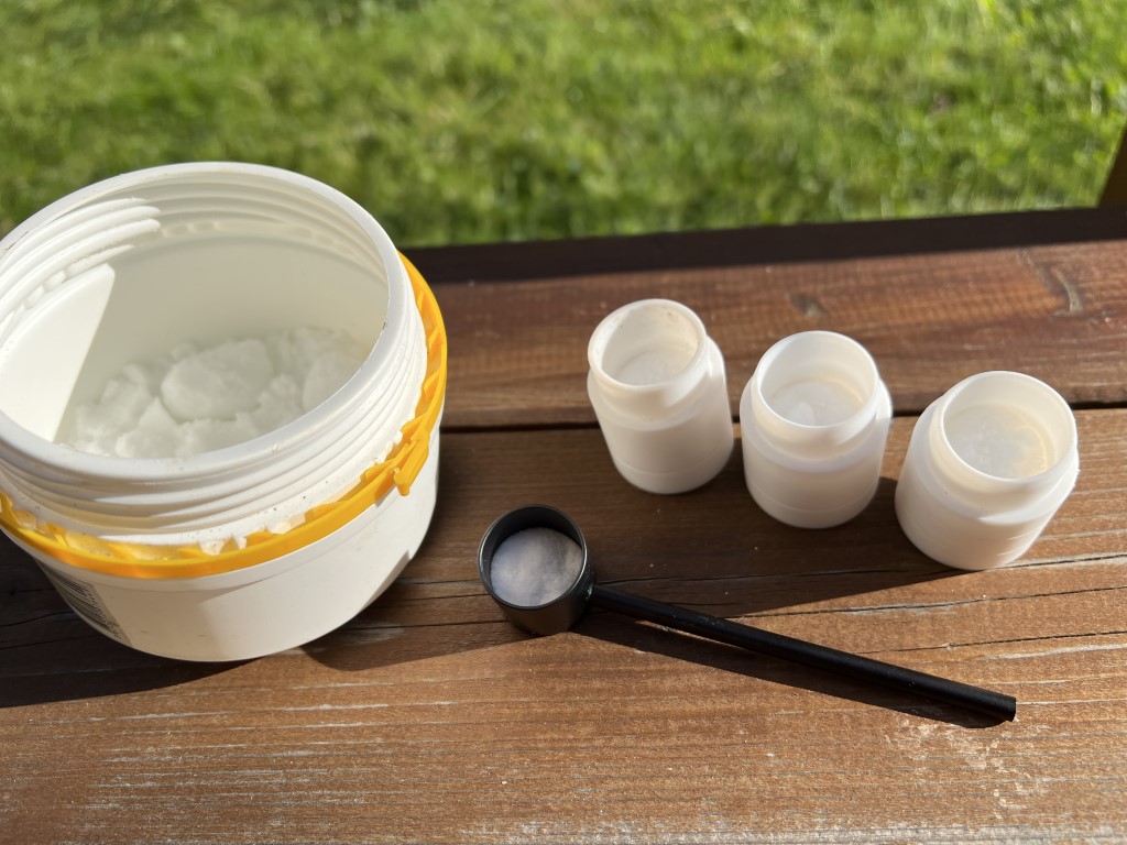 Prepare the oxalic acid: measure about 1–2 g of oxalic acid into each cap using the supplied spoon.