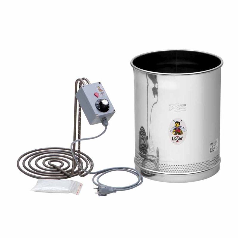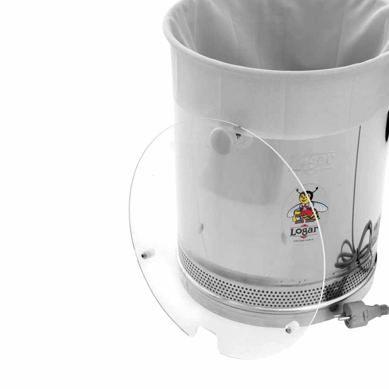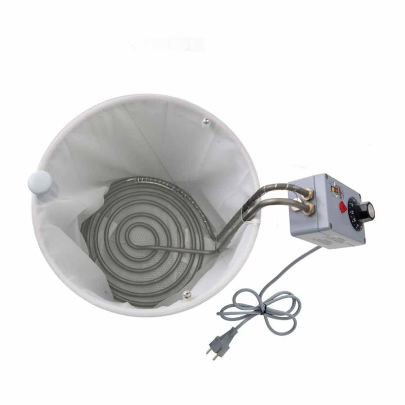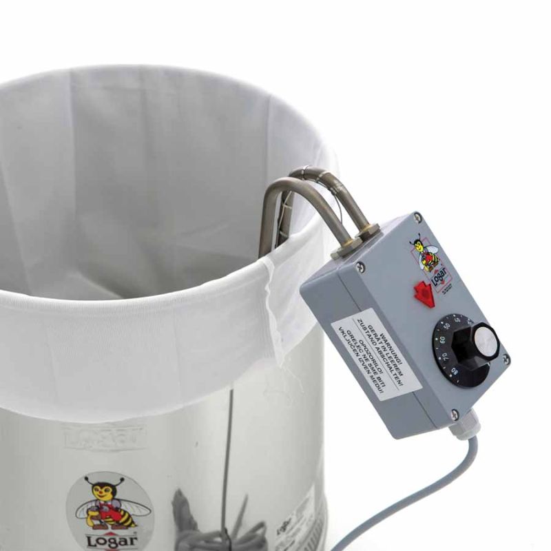 Place a suitable receiving container (internal Ø 30.6–30.8 cm) under the Honeytherm. We recommend Logar filling containers with an internal diameter of 30.7 cm (35, 50 kg). Insert the straining bag into the clarifying vessel, stretch it over the rim and place the heating coil inside. Add the honey so that the lower heating coil is completely covered. Only then set the thermostat to approx. 65 °C.