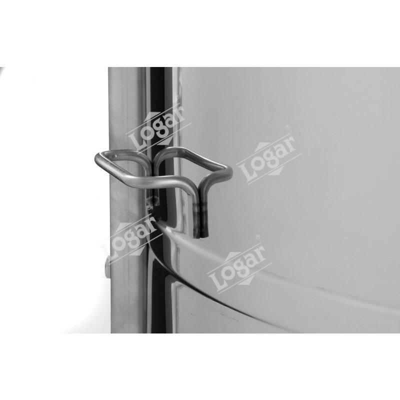 24/12-frame radial honey extractor by Logar, with 180 W / 230 V motor drive, fully electronic automatic control and integrated safety device that automatically shuts off the motor when the lid is opened. State-of-the-art engineering enables an innovative design of the extractor bottom. The drum bottom is seamlessly welded and sloped toward the outlet. The extractor is equipped with two stainless pinch valves 6/4\"; one of them is fitted at the lowest possible point so that all honey can run out of the extractor. All parts that come into contact with honey are made from food-grade materials. The lid is made of transparent acrylic.