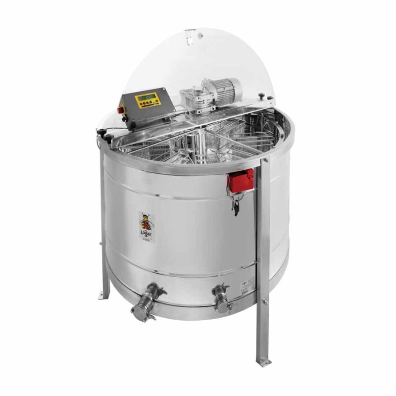 16-frame self-reversing honey extractor with 750 W / 230 V motor drive, fully automatic control and an integrated safety lock that prevents the lid from being opened during operation. The frame pockets in the extractor are double-sided, with a sheet between them for the honey to flow off. The extractor is fitted with two stainless squeeze valves. The valve(s) are installed at the lowest possible point so that all honey can drain from the extractor. All parts that come into contact with honey are made from food-grade materials. The lid is made of transparent acrylic.