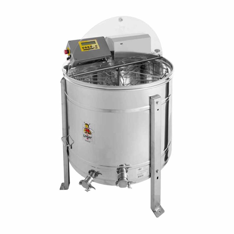4-frame self-reversing honey extractor with 180 W / 230 V motor and fully automatic control. It features an integrated safety switch that automatically stops the motor when the lid is opened. State-of-the-art technology allows an innovative design of the extractor floor. The tank floor is seamless-welded and sloped towards the outlet. The stainless steel pinch valve is fitted at the lowest possible point so all honey can drain from the extractor. All parts that come into contact with honey are made from food-grade materials. The lid is made from transparent acrylic. This extractor accommodates larger frames up to a height of 28.6 cm. For this reason the lid is opened over the motor using special hinges.