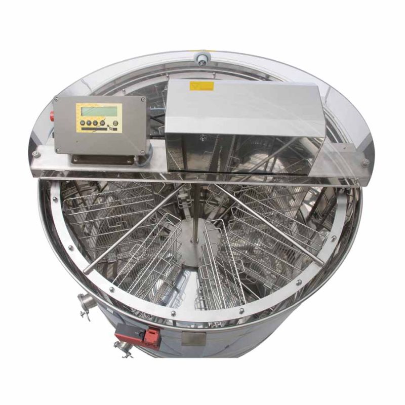 The 8-frame self-reversing honey extractor from Logar (fully electronic) is equipped with a 250 W motor (230 V), a fully automatic control unit and an integrated safety device that automatically stops the motor when the lid is opened. The extractor has two stainless steel pinch valves 6/4'' (Ø 42 mm); one is fitted at the lowest possible point so that all honey can drain from the drum. All parts that come into contact with honey are made from food-grade materials. The lid is transparent acrylic.