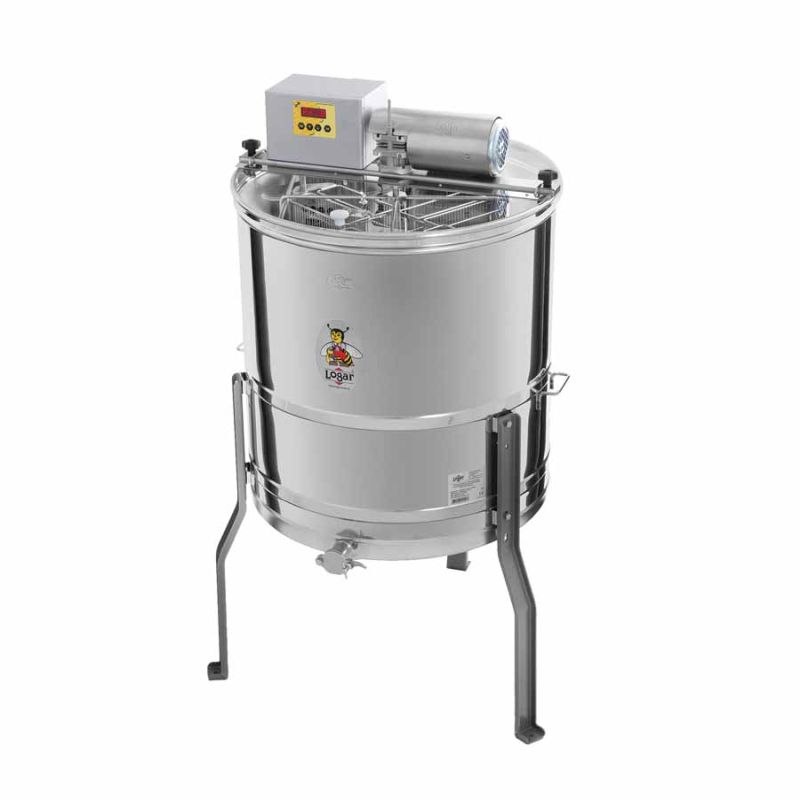 4-frame self-turning honey extractor with 110 W / 230 V motor drive, fully automatic control and safety switch that automatically stops the motor when the lid is opened. State-of-the-art engineering enabled an innovative design of the extractor bottom. The bottom of the drum is seamless-welded and inclined towards the outlet. The stainless pinch valve is welded at the lowest possible point so that all honey can drain from the extractor. All parts that come into contact with honey are made from food-grade materials. The lid is made of transparent acrylic glass. A special construction of the legs provides the extractor with stable standing security.